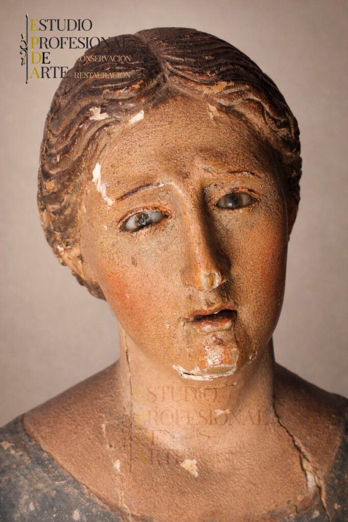 En su mayoría las piezas vienen a nuestro taller porque ha perdido una parte de su estructura, ha sufrido un accidente, ha cambiado de color, se le ha desprendido base y tiene lagunas o simplemente requiere de una limpieza y rehidratación del encarnado.